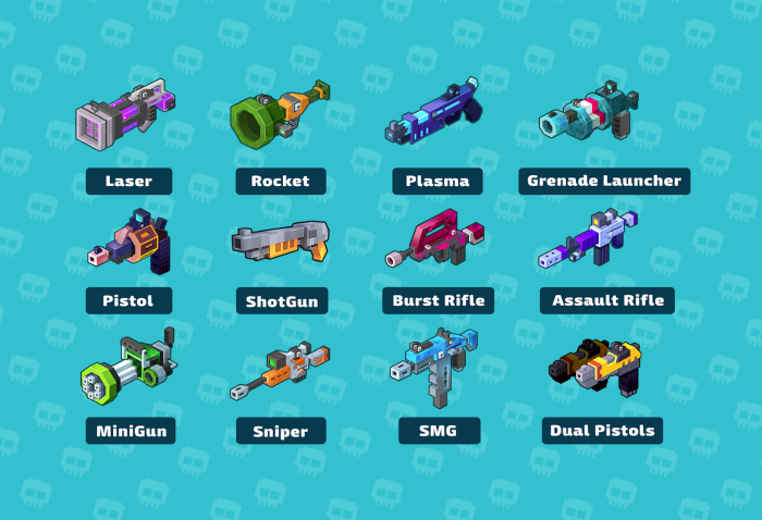 • Mini-gun: Một loại súng máy quay sáu nòng với tốc độ bắn cao. Nó gây ra DPS lớn (Sát thương mỗi giây) nếu đứng yên.