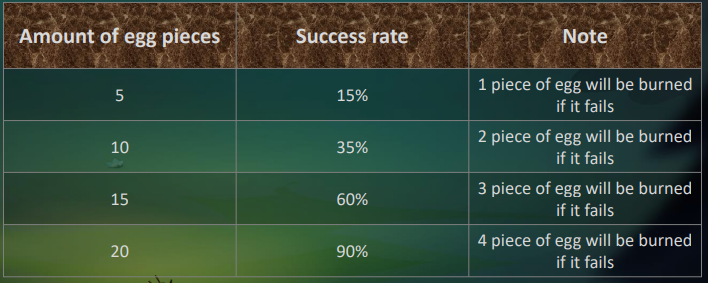 Để sở hữu được NFT trứng rắn thì bạn cần thu thập được đủ từ 5 tới 20 mảnh trứng cùng loại. Dưới đây là bảng tỉ lệ thành công khi ghép mảnh trứng: