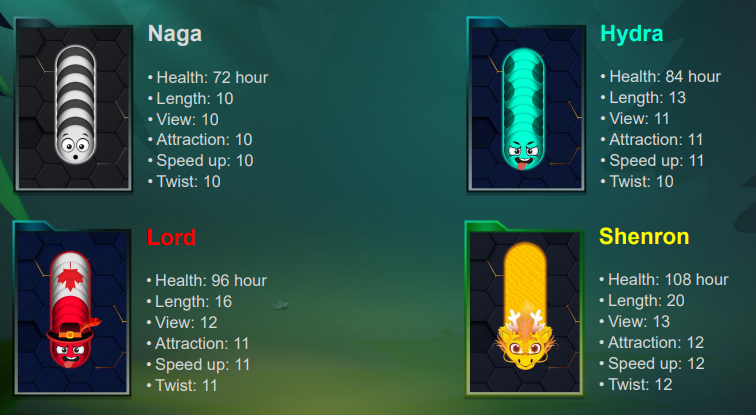 Những chú rắn trong game được mã hóa dưới dạng NFT trên nền tảng Binance Smart Chain (BSC) với số lượng giới hạn là 37.500.000 và được chia thành 4 loại: Naga, Hydra, Lord và Sheron