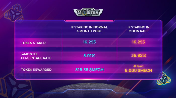 Nói chính xác hơn, trong khoảng thời gian 3 tháng đối với stake thông thường, tiền lãi sẽ được tính trên APR (tỷ lệ phần trăm hàng năm) là 20%, có nghĩa là lãi suất xấp xỉ 1,6% mỗi tháng hoặc 5,6% mỗi 3 tháng. Ví dụ: Tổng số Token được stake trong Mecha # 38 ELON hiện là 16.295$ MECH. Nếu số tiền này được đầu tư vào nhóm stake thông thường trong 3 tháng, tiền lãi kiếm được sẽ là 816,38$ MECH. Trong khi đó, với cùng một Token MECH, Moon Race chắc chắn mang lại cho ELON nhiều lợi ích hơn bao giờ hết. Nếu Mecha của bạn là người về đích hàng đầu khi về đích như # 436 NEO, thì phần thưởng của bạn sẽ được tăng lên nhiều lần.