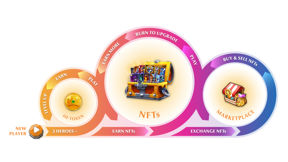 Nền kinh tế của Heroes & Empires khác với nền kinh tế của các trò chơi GameFi khác ( Có 2 token trong game). Mặt khác, Heroes & Empires tập trung vào các tài sản NFT như Hero NFT, Gear NFT và Land NFT. Nền kinh tế của Heroes & Empires được thiết kế theo một vòng khép kín, với token HE đóng vai trò chính. Người chơi sẽ kiếm được tài sản NFT bằng cách sử dụng HE.