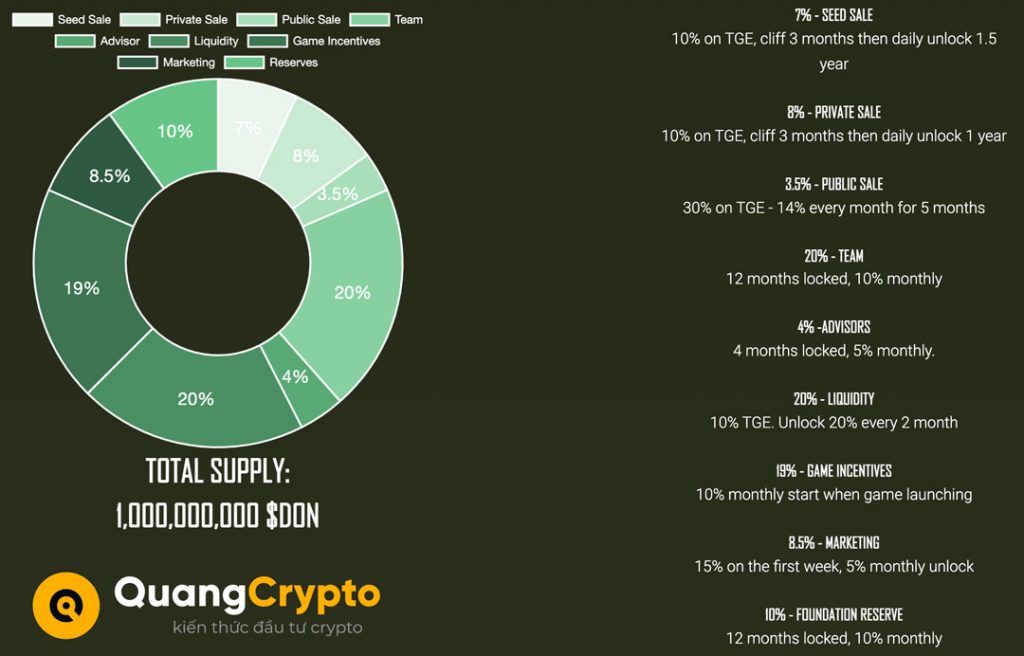 - Private Sale: 10% tại TGE, giữ trong 3 tháng sau đó mở khóa hàng ngày trong 1 năm.