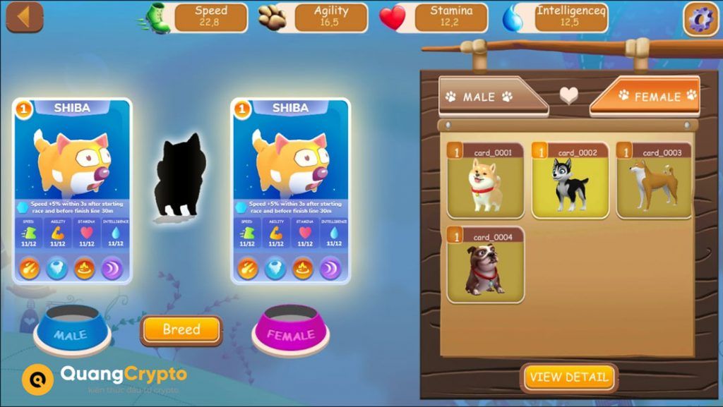 Một thẻ chó có thể kết hợp với các thẻ chó khác để tạo ra một con chó mới. Có hai loại thẻ chó là đực và cái.