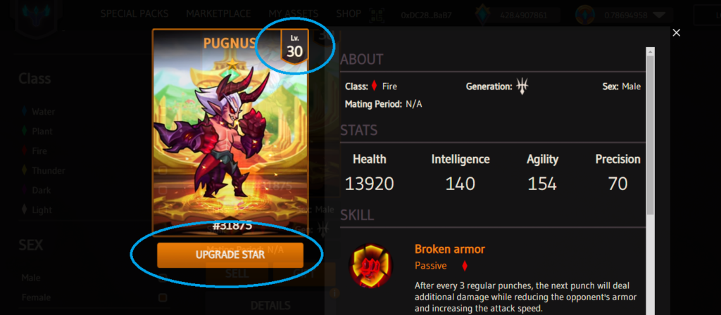 Lưu ý: Khi Hero của anh em đạt Level 30 và anh em cần có 1 Hero dự phòng thì anh em mới có thể nâng cấp sao cho Hero của mình. Anh em có thể sử dụng vàng để nâng cấp Hero của mình ( Vàng có thể kiếm dễ dàng sau mỗi trận đấu hoặc có thể mua tại app/herofi.io//shop )
