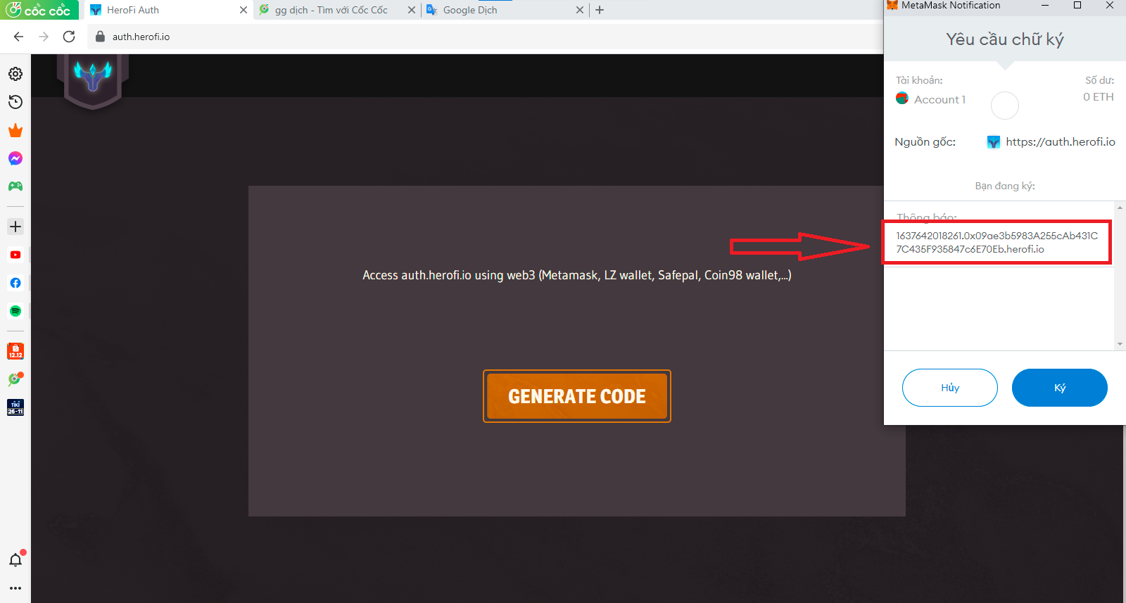 Sau khi click vào “GENERATE CODE” thì đây chính là mã code của anh em. Sau đó anh em click vào “Ký” để bắt đầu chơi game