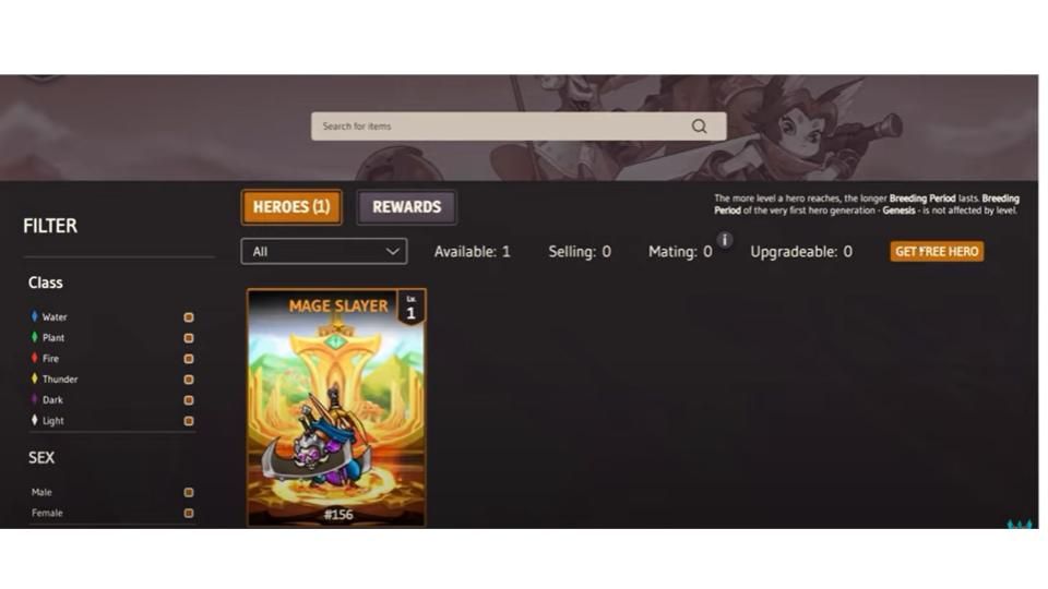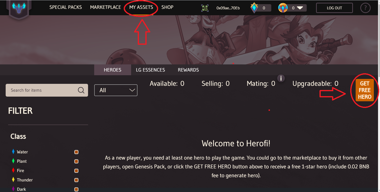 Click vào “My assets” góc bên trên màn hình và sau đó click vào “Get Free Hero” Để nhận 1 Hero 1 sao.