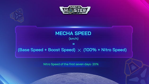 Trong bảy ngày đầu tiên của Moon Race, tất cả các Mecha sẽ nhận được 20% Nitro Boost miễn phí với điều kiện khi có người tăng tốc độ Mecha thông qua stake Token MECH. Sau một khoảng thời gian, Nitro Boost sẽ không còn hiệu lực, và Mecha sẽ reset về tốc độ ban đầu..