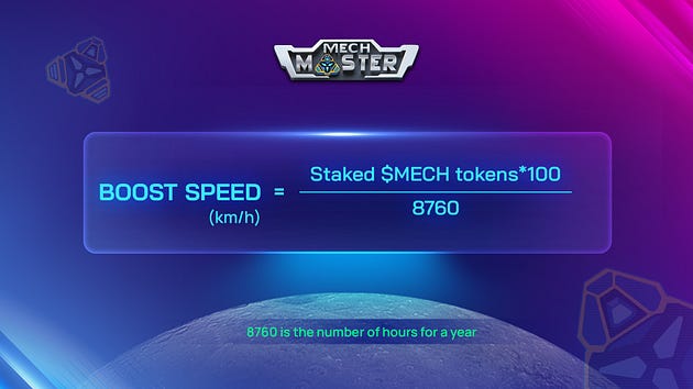 Mỗi người chơi tham gia Moon Race đều có thể stake Token MECH cho các Mecha yêu thích của mình để tăng tốc độ của chúng. Tốc độ được tăng thêm được tính theo công thức sau đây: