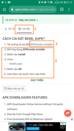 - Bước 7: Tiếp đó chúng ta click vào mục “Cài đặt” ở mục (1) sau đó nhấn vào dòng chữ mầu xanh ở mục (2) với nội dung là “APKCombo Installer” để tải ứng dụng hỗ trợ và cài đặt file APK. Cuối cùng, hoàn thành mục (3) là các bạn có thể cài đặt hoàn tất trò chơi Bemil cho mình rồi, tiếp đó các bạn có thể vào ứng dụng Bemil để chơi và kiếm tiền rồi!