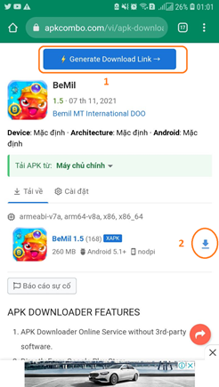 - Bước 6: Tiếp đó các bạn hãy kéo xuống một chút và Click vào mục “Generate Download Link” ở mục (1) để hiển thị ứng dụng cần download, sau đó nhấn vào phần mũi tên đi xuống ở mục (2) để tải Bemil về bằng file APK.