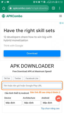 - Bước 5: Nhấn giữ vào phần Google Play URL để hiện thị thanh công cụ và dán địa chỉ liên kết đã sao chép ở Bước 2 (B2) trước đó.