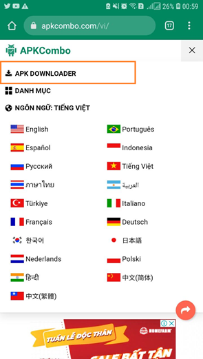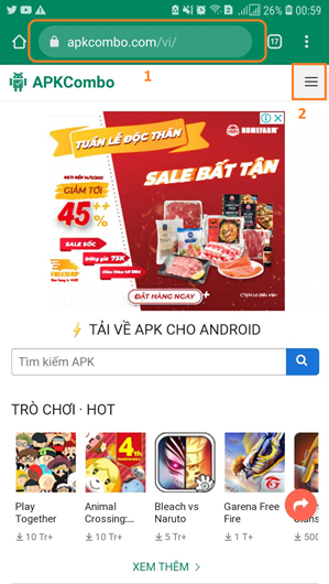 - Bước 3: Sau khi sao chép địa chỉ liên kết của game Bemil, tiếp đó chúng ta mở một tab mới hoặc tìm kiếm trực tiếp tại tab hiện tại và vào website apkcombo.com Sau đó click vào thanh Menu có biểu tượng 3 gạch ngang ở bên phải để hiện mục APK DOWNLOADER