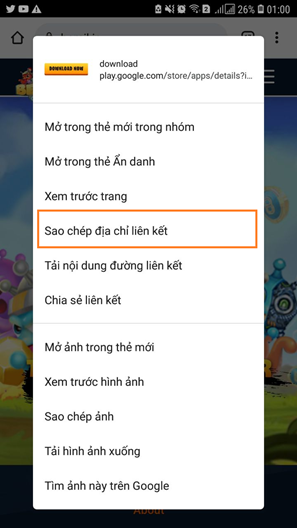 - Bước 2: Sau khi nhấn giữ phần “Download Now” trong 2 giây để hiển thị thanh công cụ tiếp đó Click “Sao chép địa chỉ liên kết” để sao chép địa chỉ liên kết tới ứng dụng Bemil trên CHPlay.