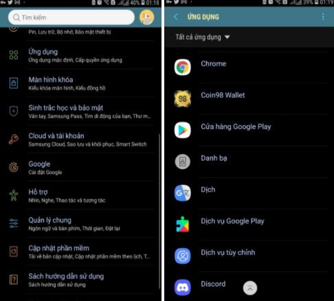 Vào ứng dụng Cài Đặt trên điện thoại → Click vào Ứng dụng → Click Cửa hàng Google Play (CHPlay).