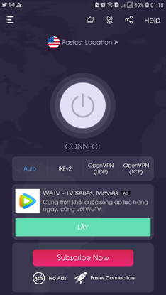 Sau khi cài đặt ứng dụng Fake IP VPN – Super Unlimited Proxy. Tại giao diện ứng dụng Fake IP → Click Connect để Fake IP → Sau khi Connect thành công sẽ hiển thị số thời gian đang connect Fake IP (Fake IP thành công).