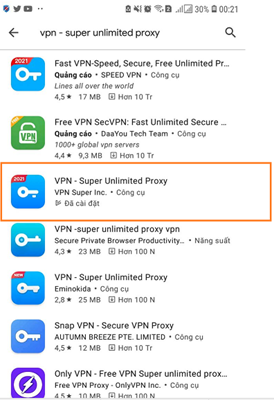 Đầu tiên, các bạn vào CHPlay và gõ VPN – Super Unlimited Proxy và cài đặt ứng dụng như hình dưới đây (ứng dụng này đang có hơn 10 Triệu lượt tải)