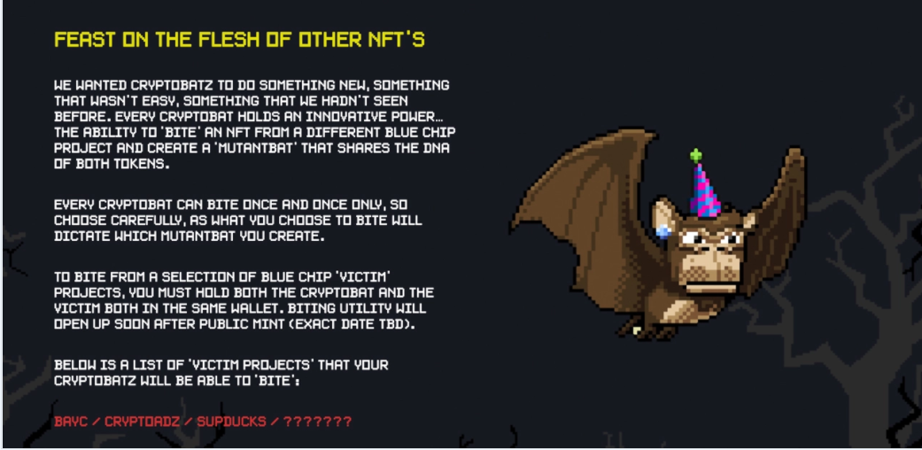 Cổng thông tin web Cryptobatz NFT của Osbourne cho thấy rằng NFT cung cấp một thứ tương tự như khả năng của Câu lạc bộ Du thuyền Bored Ape (BAYC) để biến đổi thành vượn đột biến. Cryptobatz có thể biến đổi thành Mutantbatz cho phép chủ sở hữu nhận được một NFT đặc biệt ngoài bản gốc sau khi nó bị “cắn”. Ngoài ra còn có “Ancientbatz”, cung cấp cho chủ sở hữu Cryptobatz khả năng độc quyền để truy cập vào một “cuộc truy tìm kho báu thay đổi cuộc đời”.