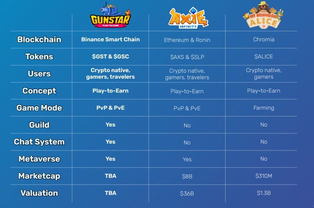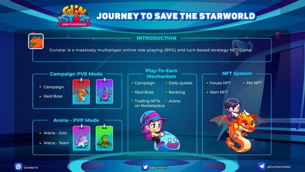 Lấy cảm hứng từ Worm và Gunbound, Gunstar là trò chơi NFT Game chiến lược theo lượt và nhập vai trực tuyến nhiều người chơi được xây dựng trên Binance Smart Chain, nơi mọi người đều có thể trở thành anh hùng để giải cứu Thế giới Ảo tưởng khỏi động vật đột biến. Gunstar sẽ mang đến cho game thủ cơ hội thể hiện tài năng thiện xạ, giao lưu với cộng đồng game thủ toàn cầu, cũng như hưởng lợi nhuận khủng từ những phần thưởng độc quyền khi chơi game.