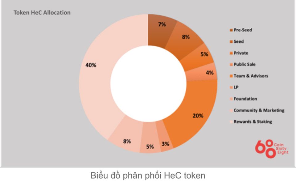 Pre-Seed khoá 9 tháng, sau đó trả dần theo ngày trong 24 tháng Seed Sale khoá 4.5 tháng, sau đó trả dần theo ngày trong 15 tháng Private Sale khoá 3 tháng, sau đó trả dần theo ngày trong 12 tháng Public Sale trả dần theo tháng trong 6 tháng Team và Cố vấn khoá 9 tháng, sau đó trả dần theo ngày trong 24 tháng Nhà cung cấp thanh khoản trả dần theo ngày trong 3 tháng Quỹ tài trợ trả dần theo ngày trong 18 tháng Cộng đồng và Marketing trả dần theo ngày trong 18 tháng Phần thưởng và Staking trả dần theo ngày trong 48 tháng HeC token dùng để làm gì?