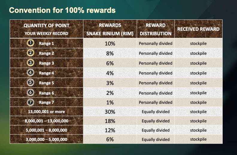 Số lượng vật phẩm sẽ tuỳ thuộc vào lượng rắn xuất hiện trong phòng chơi. Phòng càng nhiều người chơi, số vật phẩm tặng kèm sẽ ngày càng hấp dẫn. Tỉ lệ phân chia phần thưởng được chia theo: quà tặng cho tuần tiếp theo, “burned”, phần thưởng cho người giữ RIM và phần thưởng cho bảng xếp hạng.