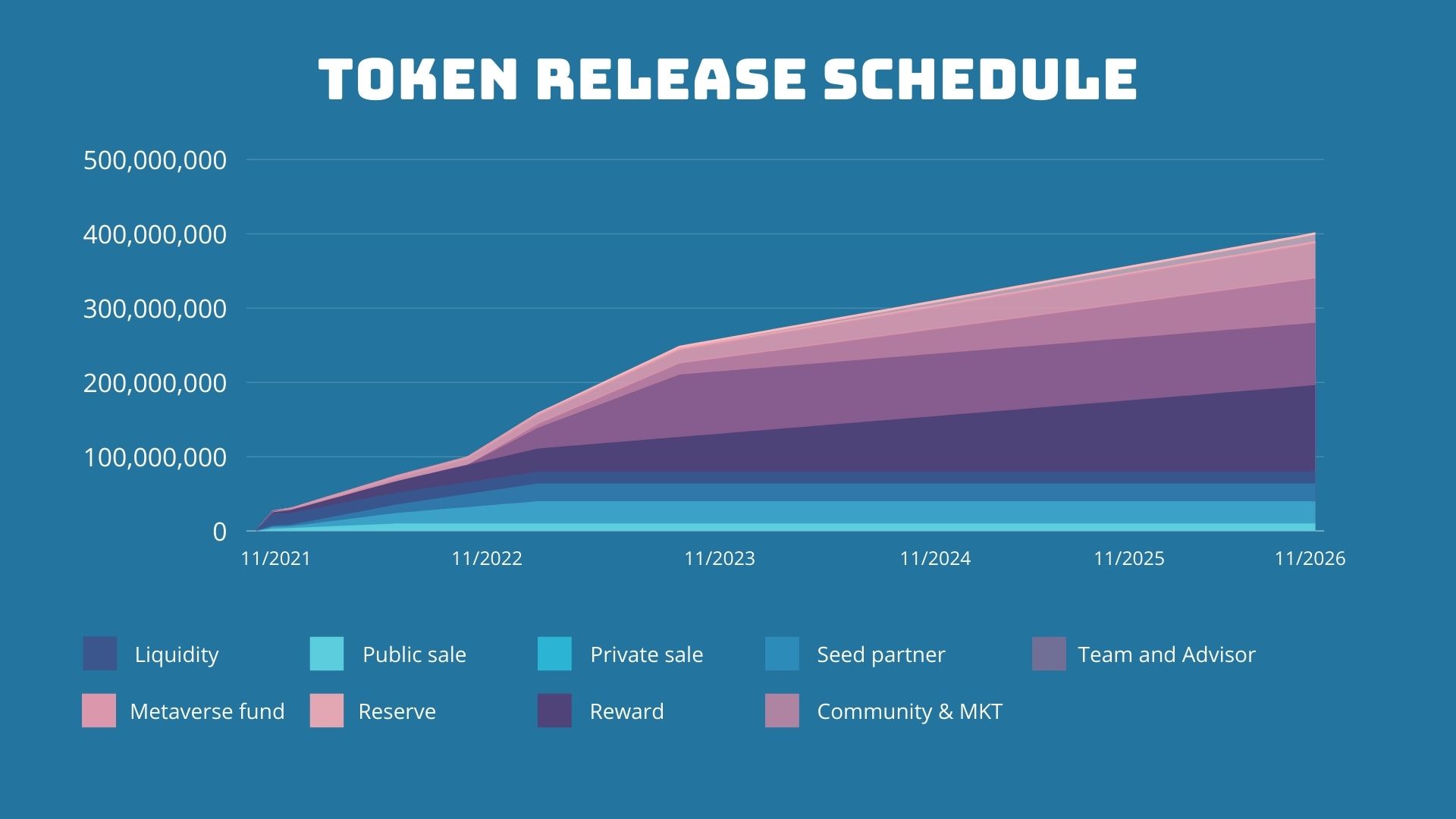Tính thanh khoản16.000.000 4,0% Mã thông báo dành riêng cho nhóm thanh khoản DEX. Quỹ Metaverse 60.000.000 15,0% Mã thông báo dành riêng cho phát triển metaverse Dự trữ 8.000.000 2,0% Các mã thông báo được sử dụng để phát triển trò chơi, tăng trưởng hệ sinh thái, chi phí hoạt động, tính thanh khoản và trao đổi. Tổng cung