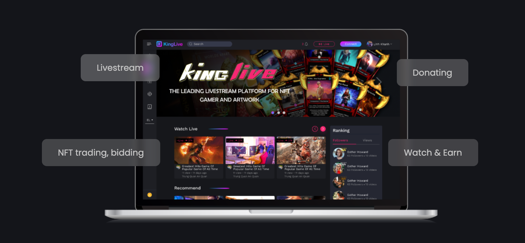 Nền tảng Kinglive NFT Streaming là một kênh khổng lồ giúp nhà sản xuất, streamer và người chơi trò chơi mở rộng nội dung trò chơi. Ngoài tính năng livestream thông thường, Kinglive còn có thể đăng tải video rất tiện lợi. Bên cạnh đó, đây cũng là nền tảng livestream hàng đầu về chơi game và tác phẩm nghệ thuật NFT.