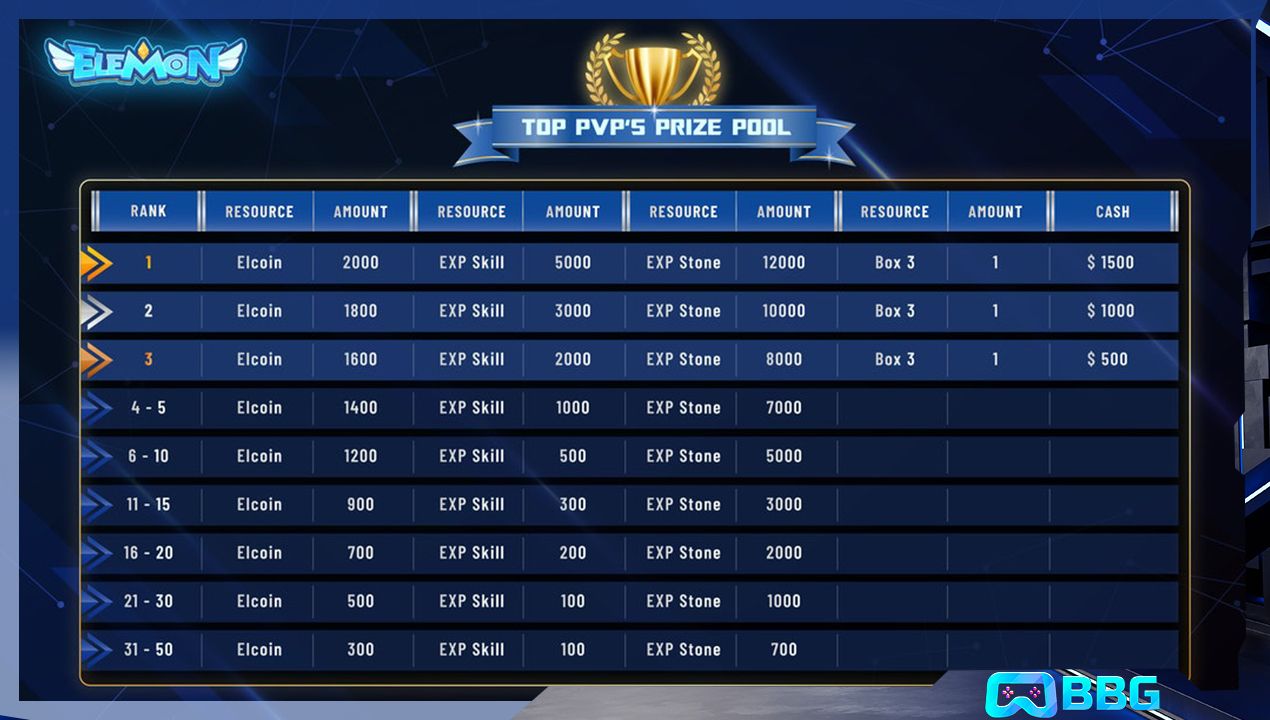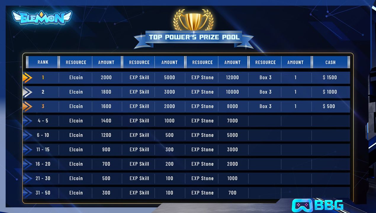 • Tài nguyên trong game (ELCOIN, kỹ năng EXP, đá EXP, Hộp bí ẩn Elemon 3)