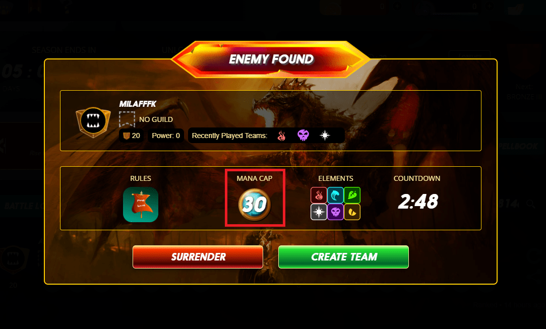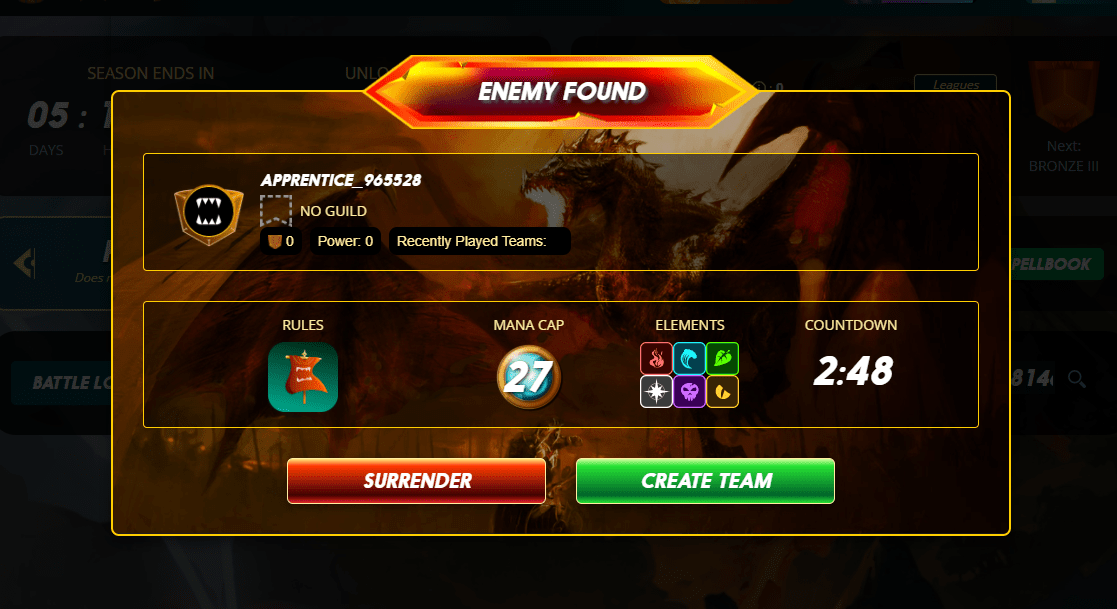 2. Hệ thống sẽ chọn ngẫu nhiên đối thủ cho bạn. Sau khi thông tin trận đấu xuất hiện, click Create Team để tham gia hoặc Surrender để nhận thua (tính như 1 trận đấu thua và thứ hạng của bạn sẽ bị ảnh hưởng).