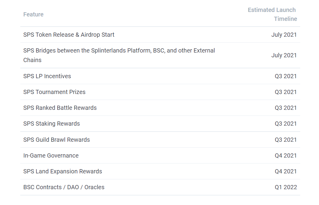 Phần còn lại của cơ chế trò chơi xoay quanh mã token SPS cũng được lên kế hoạch phát triển song song với các hợp đồng thông minh BSC và được phát hành theo từng giai đoạn khi chúng hoàn thành. Dưới đây là roadmap mà Splinterlands thông tin về các bản phát hành dự kiến của từng tính năng: