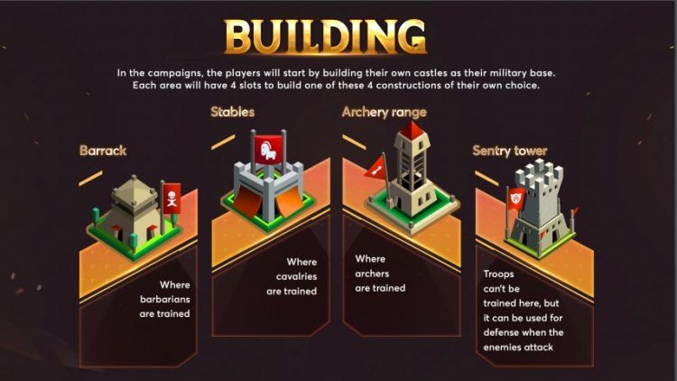 Trong game, người chơi sẽ bắt đầu bằng việc xây dựng các lâu đài của riêng cho mình để làm căn cứ quân sự. Mỗi khu vực sẽ xây dựng 4 công trình ở 4 vị trí khác nhau:
