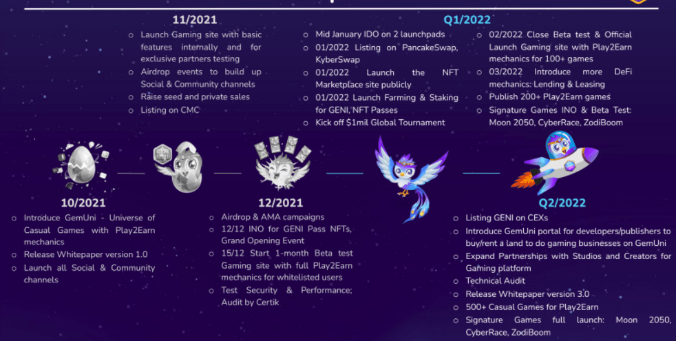 GemUni mong muốn trở thành “Steam phi tập trung” cho các trò chơi thông thường để người chơi có thể kiếm tiền – một điểm đến cuối cùng của trải nghiệm GameFi đặc biệt dành cho tất cả mọi người. Trong tương lai, GemUni sẽ mang đến những ứng dụng tốt hơn và trải nghiệm sống động hơn với tư cách là một Metaverse cho Casual Game. Hãy theo dõi game6 để cập nhật những thông tin mới nhất về dự án.