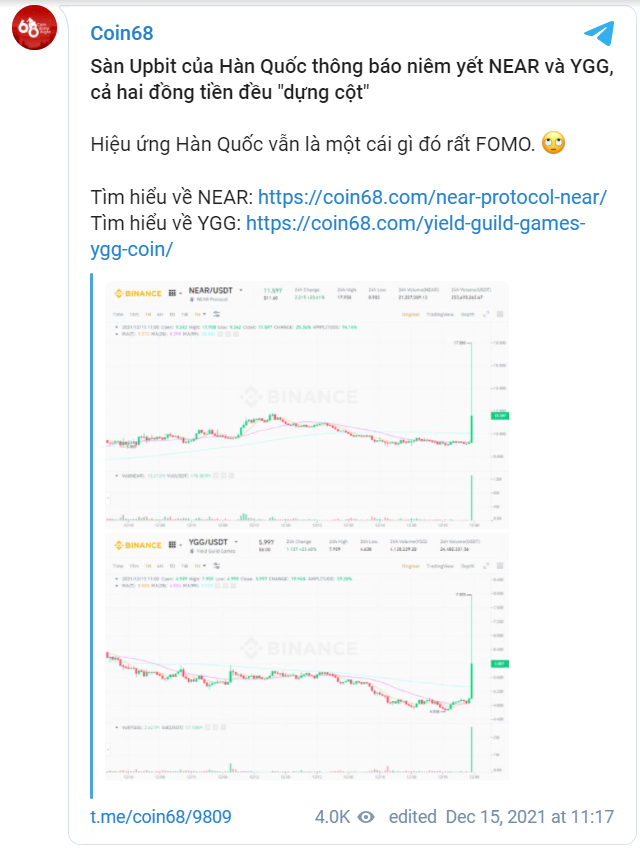 Điển hình là hiệu ứng “Kimchi Premium” từng xảy ra rất nhiều trong lịch sử, thậm chí CoinMarketCap phải dừng lấy tham chiếu giá từ các sàn giao dịch Hàn Quốc vì chỉ số này quá cao. Mới đây, nhờ vào tin list sàn Upbit, Near cũng đã ghi nhận mức tăng trưởng chóng mặt chỉ trong thời gian ngắn.