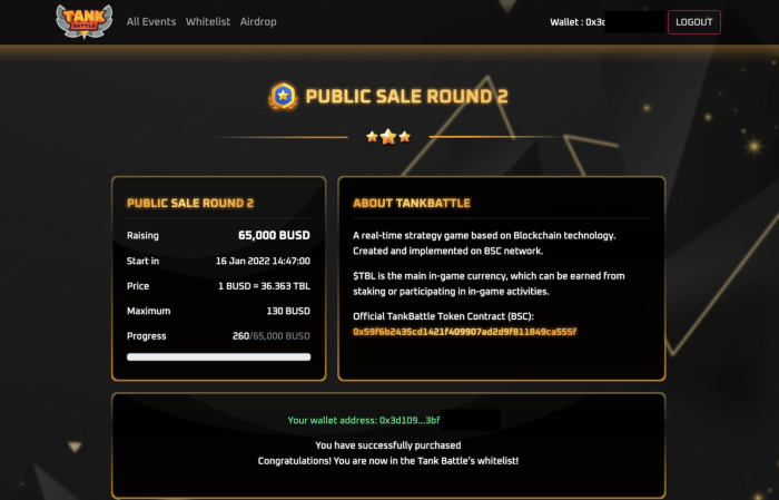 Bước 1: Truy cập vào https://launch.tankbattle, nhấp vào Public Sale Round 2 sau đó kết nối với ví Metamask của bạn.