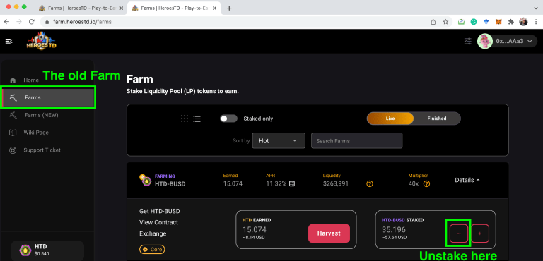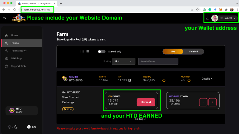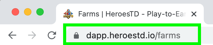 Cảnh báo quan trọng: Hiện tại có rất nhiều bên giả mạo website với tên miền gần giống với của Heroes TD. Anh em cần truy cập đúng website để tránh trường hợp tài sản của mình bị kẻ gian chiếm đoạt. Tên miền của Heroes TD chỉ có định dạng như sau dapp.herotd.io/farms.