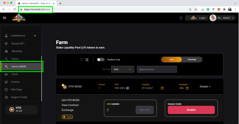 Truy cập vào Yield Farming Version 2 của Heroes TD tại dapp.heroestd.io và click chọn mục Farms