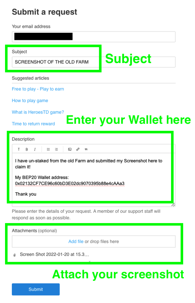 Gửi hình ảnh anh em vừa chụp qua Zendesk Ticket. Sau khi anh em chụp ảnh quá trình Yield Farming với Version 1 của mình thì gửi anh vào Zendesk Ticket.