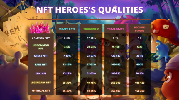 NFT Hero trong Bemil Coin không chỉ là đồ sưu tầm mà còn ảnh hưởng đến khả năng kiếm Becoins. Vì NFT Hero sở hữu các chỉ số ảnh hưởng trực tiếp đến khả năng kiếm Becoin của người chơi: Escape Rate, Toughness và Becoin Bonus. Chất lượng của NFT càng cao thì khả năng giải mã và khai thác Becoin càng lớn.
