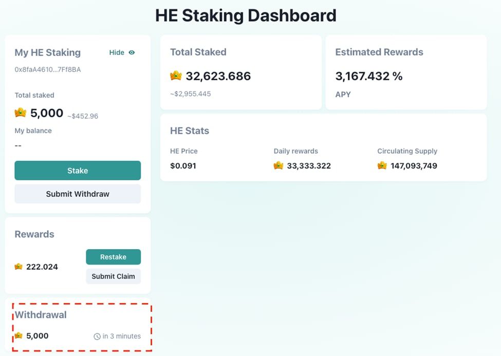- Nút “Submit Withdraw”: Yêu cầu Unstake HE. (86.400 Block đang chờ xử lý, dự kiến 3 ngày)