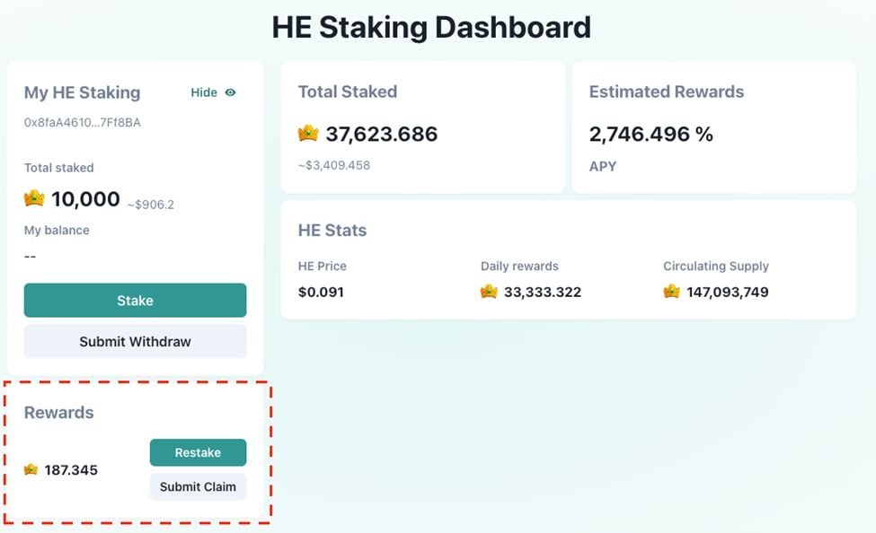 - Claim Reward: Sau thời gian chờ, anh em có thể rút HE về ví của mình