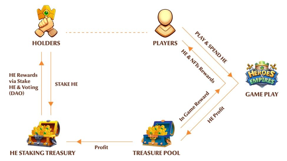Số lượng phần thưởng HE sẽ được tính toán và phân bổ vào kho bạc HE dựa trên tình hình doanh thu hàng tháng trong nền kinh tế Heroes & Empires.