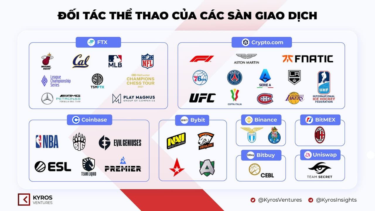 Tiếp đến là gã khổng lồ Coinbase, cũng đã tài trợ cho các đội Esports như Evil Geniuses và Team Liquid, cùng với nhà điều hành giải đấu ESL. Bybit góp mặt trong danh sách với hai ứng đại diện nặng ký của Châu Âu là Natus Vincere (NAVI) và Virtus.pro, Crypto.com trở thành đối tác toàn cầu của Fnatic bên cạnh mối quan hệ của Uniswap cùng Team Secret.