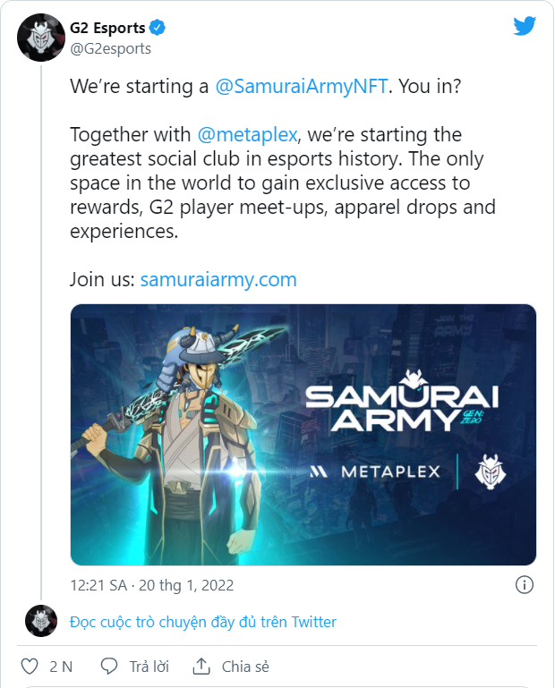 Mỗi NFT Samurai Army cũng được tính là một vé đại diện cho thành viên độc quyền của G2 Esports, với quyền truy cập vào cộng đồng ưu tiên, tương tác với các tuyển thủ chuyên nghiệp, tiếp cận sớm vào phần thưởng G2 NFT trong tương lai, cùng những lợi ích tiềm năng bổ sung bao gồm cơ hội cạnh tranh với nhiều chuyên gia thể thao điện tử và cơ hội tham dự các cuộc thi trong tương lai. Giám đốc điều hành G2 Esports, Carlos Rogriguez, cho biết: