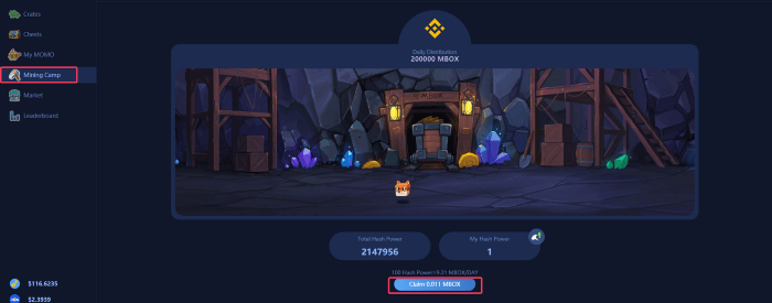 Phần MOMO Mining Camp chỉ đơn giản là nơi hiển thị tất cả các MOMO mà bạn sở hữu, thể hiện tổng Hash Power của bạn. Trong trang này, bạn cũng có thể yêu cầu MBOX do MOMO của bạn đã khai thác. Xin lưu ý rằng để yêu cầu nhận MBOX, bạn sẽ cần có BNB trong ví của mình để trang trải phí gas.