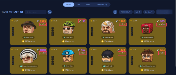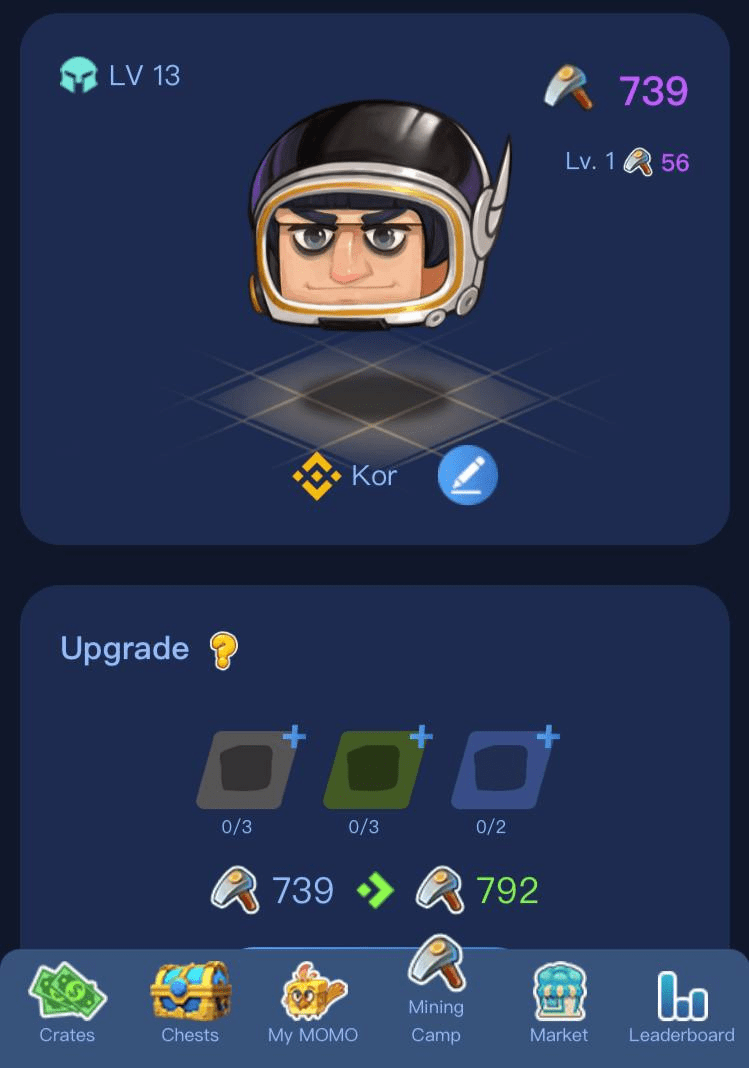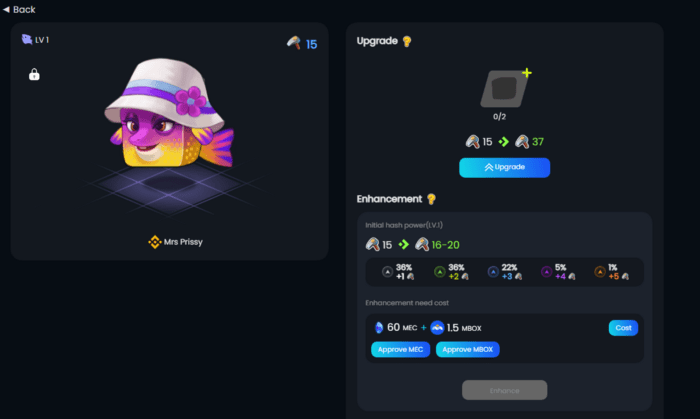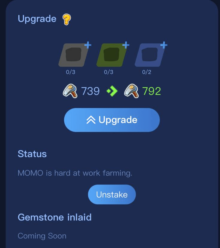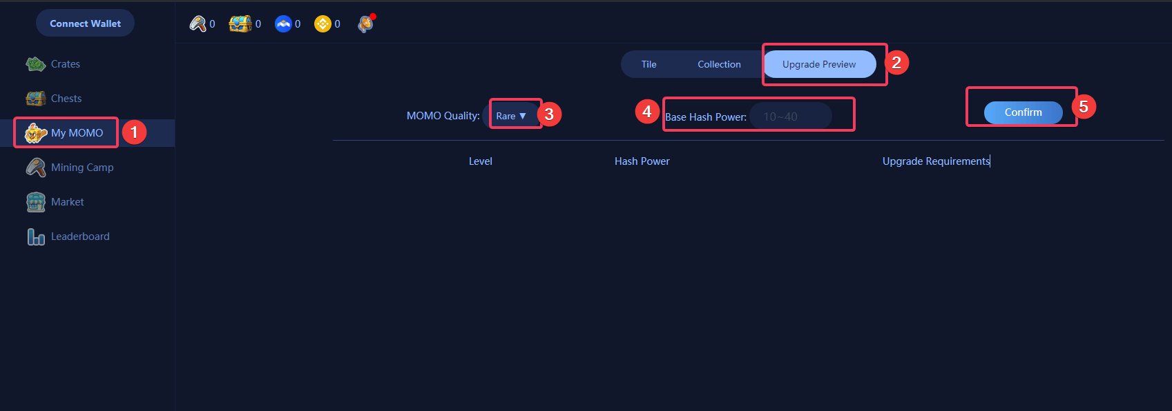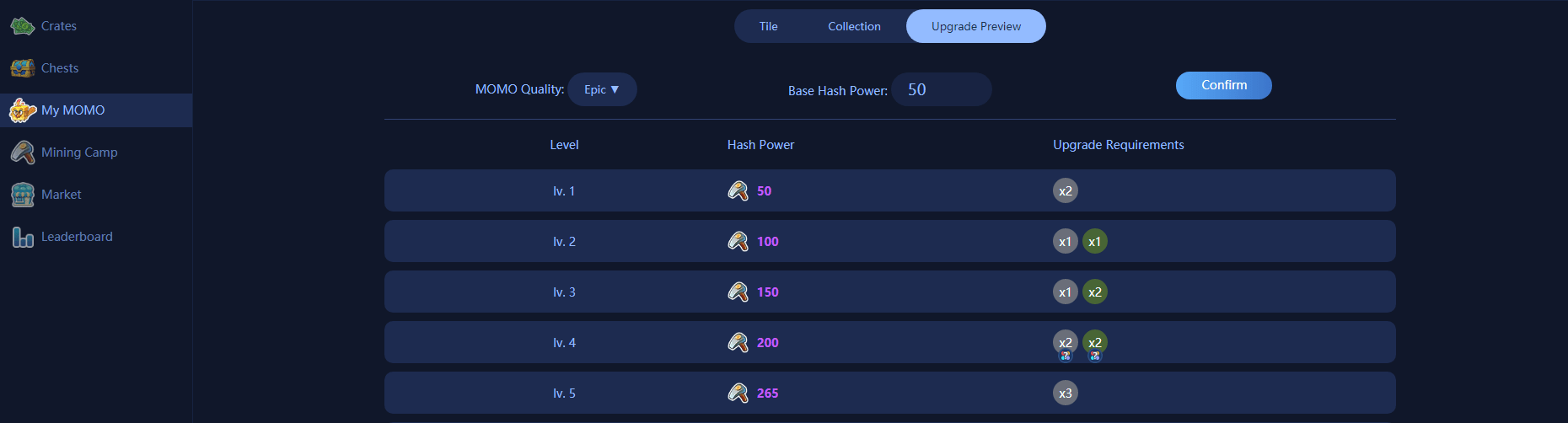 Tại đây, bạn có thể thấy các MOMO cần thiết được sử dụng cho mỗi cấp độ và hash power mới mà MOMO của bạn sẽ có sau khi nâng cấp.