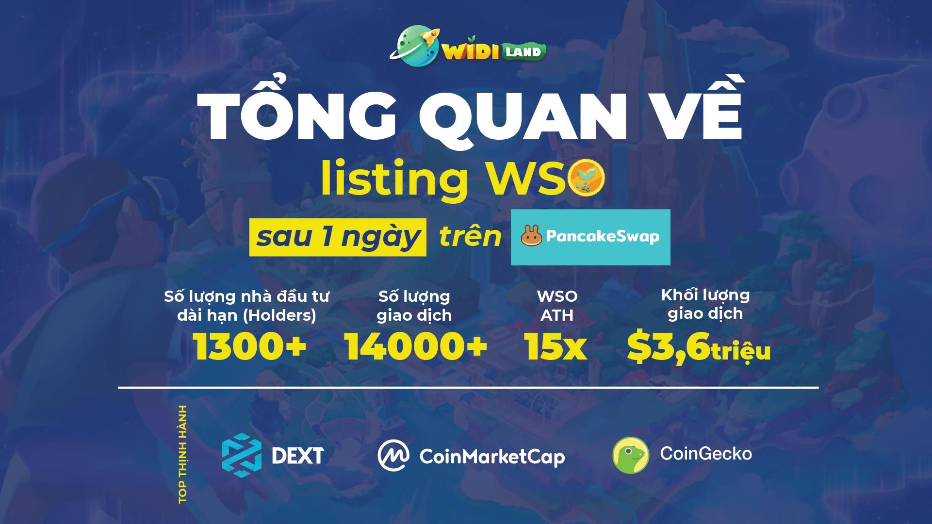 Nhờ những con số thật sự ấn tượng mà sự kiện Listing WSO trên PancakeSwap đạt được – đặc biệt phải kể đến việc đứng Top Trending trên Dextool, CoinMarketCap và Coingecko – WidiLand đang chứng minh được tiềm năng phát triển vượt bậc về lâu dài, chiếm được ngày càng nhiều sự tin tưởng của cộng đồng yêu thích GameFi nói riêng và cộng đồng tiền mã hóa nói chung. Mua WSO ngay để có thể trải nghiệm WidiLand với những tính năng hấp dẫn.