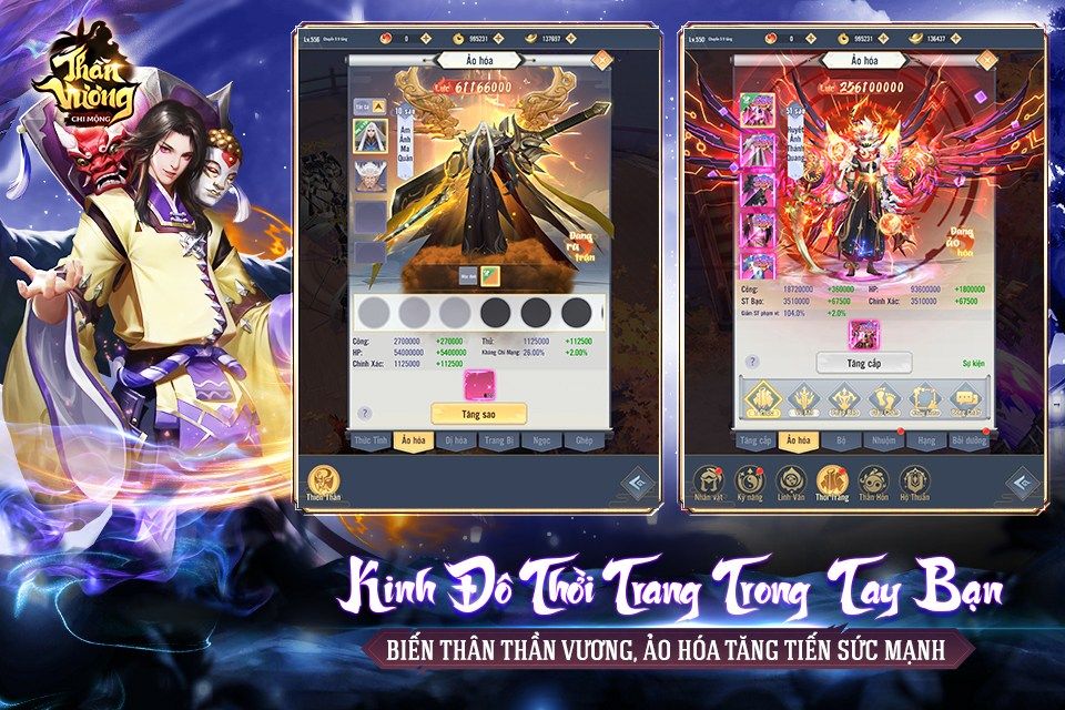 Ngoài ra sản phẩm cũng xây dựng một kho trang phục phong phú với đầy đủ kiểu dáng ảo hóa từ Cánh, Thú cưỡi, Thần binh, Pháp bảo, Tinh Linh (Pet)..v..v..cho phép bạn thỏa thích lựa chọn những set đồ phù hợp với mình.