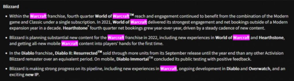 Blizzard cho biết họ đang làm việc cho bản di động Warcraft mới, được lên kế hoạch phát hành vào năm 2022. “Blizzard có kế hoạch cung cấp rất nhiều nội dung mới cho nhượng quyền thương mại Warcraft vào năm 2022, lần đầu tiên mang nội dung Warcraft di động hoàn toàn mới tới người chơi”, thông cáo viết.