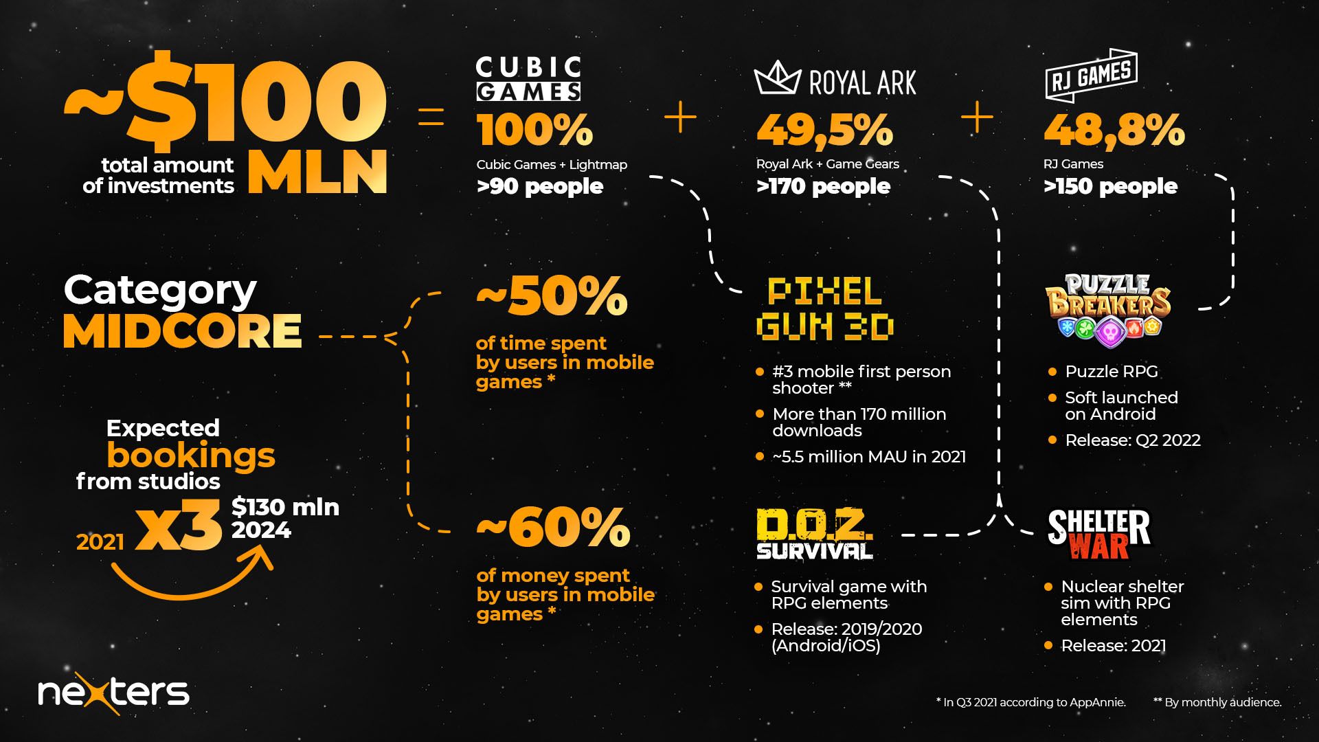 Hãng được mua lại bao gồm: Cubic Games, RJ Games và Royal Ark. Ba công ty sẽ đưa các tài sản trò chơi của riêng vào thỏa thuận trong đó có Pixel Gun 3D. Nexters đã đầu tư tổng cộng khoảng 100 triệu đô la vào thương vụ này để mở rộng số lượng trò chơi hạng trung trong danh mục đầu tư của mình. Đây là thương vụ mua bán game lớn nhất tại Nga vừa qua.