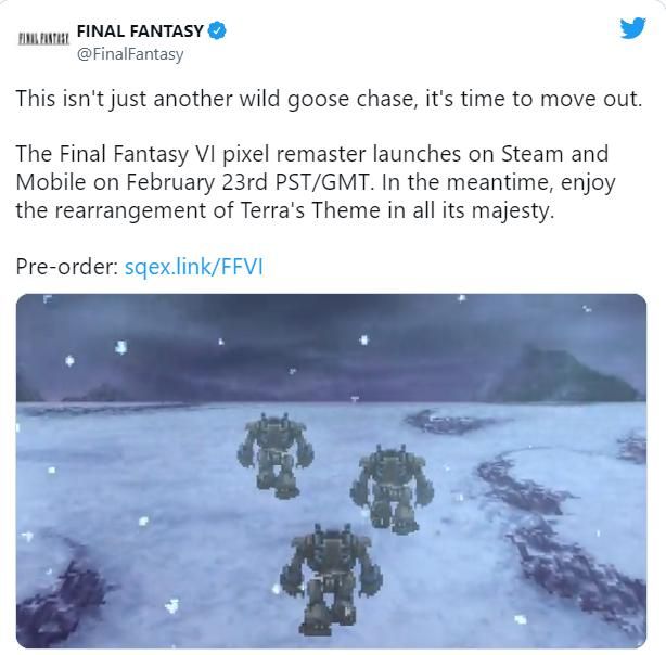 Một bản tin cập nhật được đăng lên tài khoản Twitter chính thức của Final Fantasy mới đây đã chính thức xác nhận ngày phát hành của tựa game Final Fantasy 6 Pixel Remaster sắp ra mắt. Phiên bản này sẽ chính thức phát hành chỉ sau hai tuần với thời gian được ấn định là ngày 23 tháng 2 trên Steam và các thiết bị di động. Cùng với công bố, Square Enix còn hé lộ khung cảnh mang tính biểu tượng trong đoạn mở đầu của Final Fantasy 6, đó là cảnh quay ba bộ giáp Magitek diễu hành qua một vùng lãnh nguyên đầy tuyết nhưng với một nền đồ hoạ đẹp hơn.
