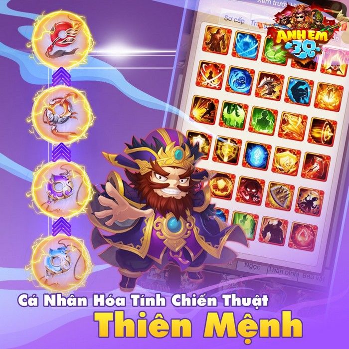 Game đề cao tính chiến thuật, bạn sẽ xây dựng cho mình một đội hình tướng mạnh mẽ để có thể vượt qua các màn chơi trong game. Hệ thống kỹ năng tướng cực kỳ đa dạng và phong phú, bạn có thể lựa chọn để trang bị cho các vị tướng yêu thích của mình những kỹ năng mà chỉ có bạn mới có thể nghĩ ra như: Hồi Nộ, Giảm Nộ, Miễn Khống Chế, Hộ Thuẫn Vô Địch...còn rất nhiều kĩ năng khác cho anh em lựa chọn khi chơi game.